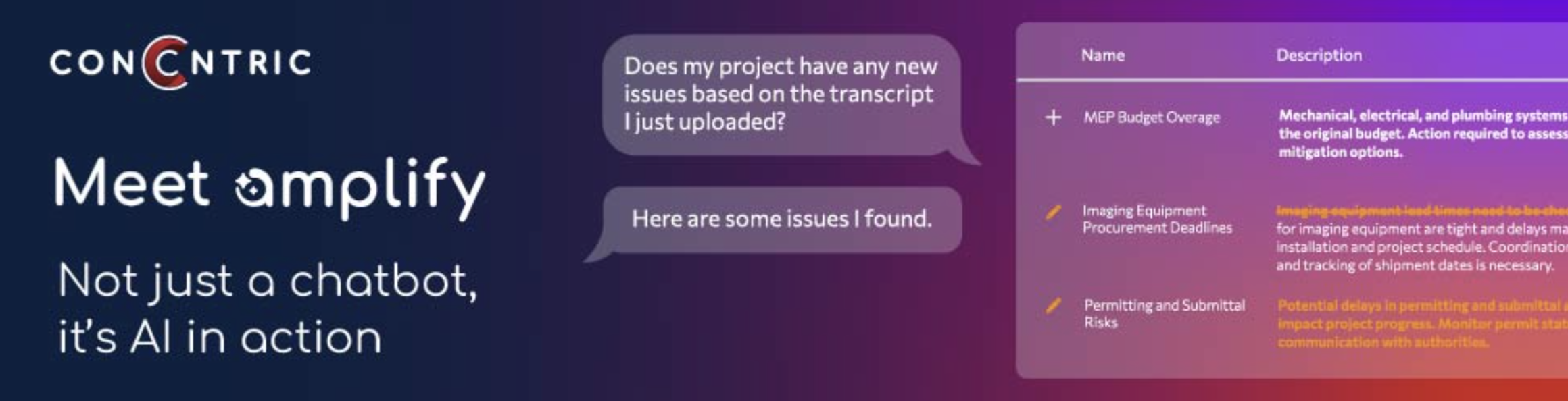 Amplify is ConCntric’s proprietary AI layer woven directly into preconstruction workflows. It enhances human expertise with contextual insights, data-driven recommendations, and autonomous execution, all within your ConCntric platform.